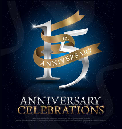 ダークブルーを背景に金色のリボンが付いた15周年記念シルバーとゴールドのロゴ ベクトルイラストレーターのイラスト素材 ベクタ Image